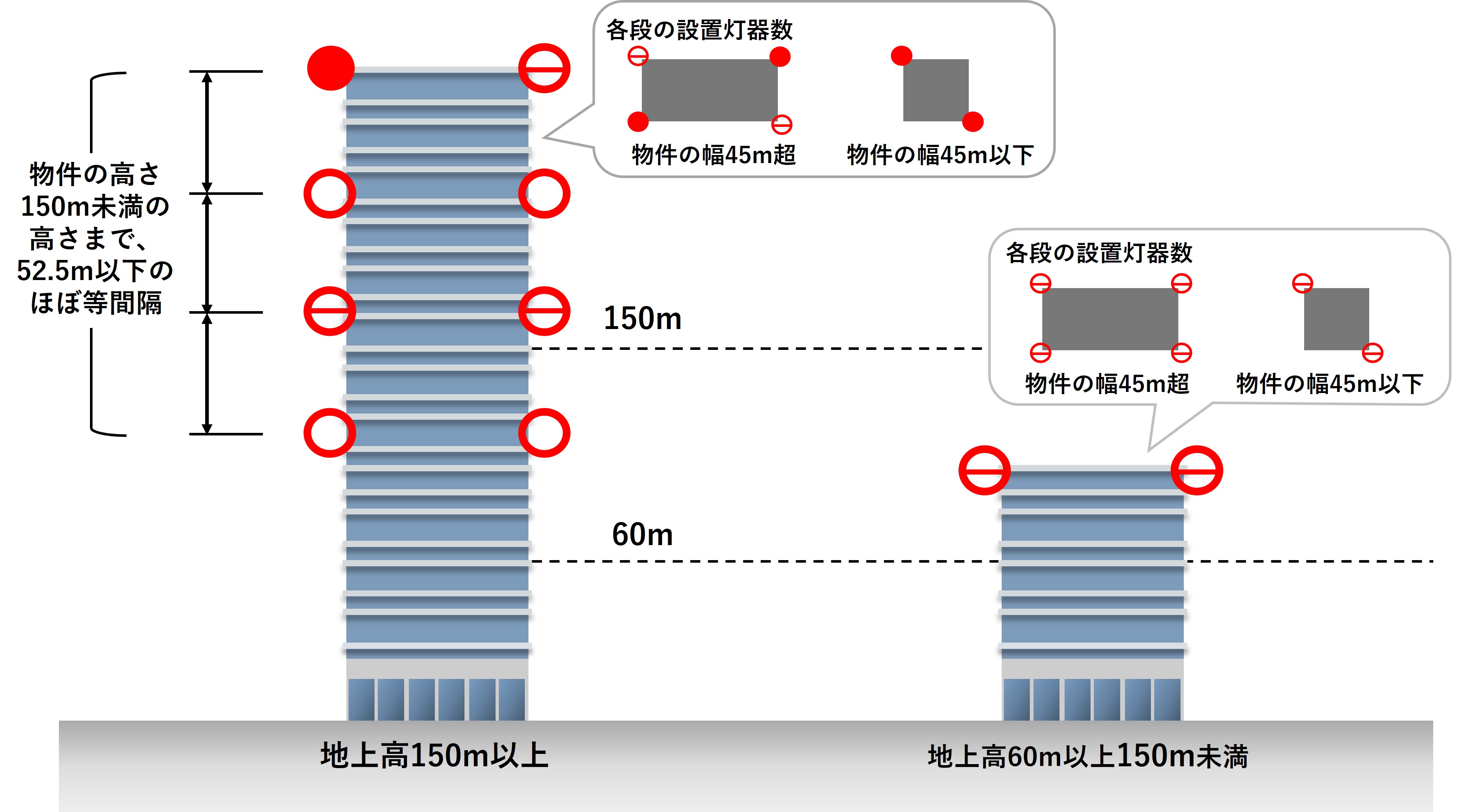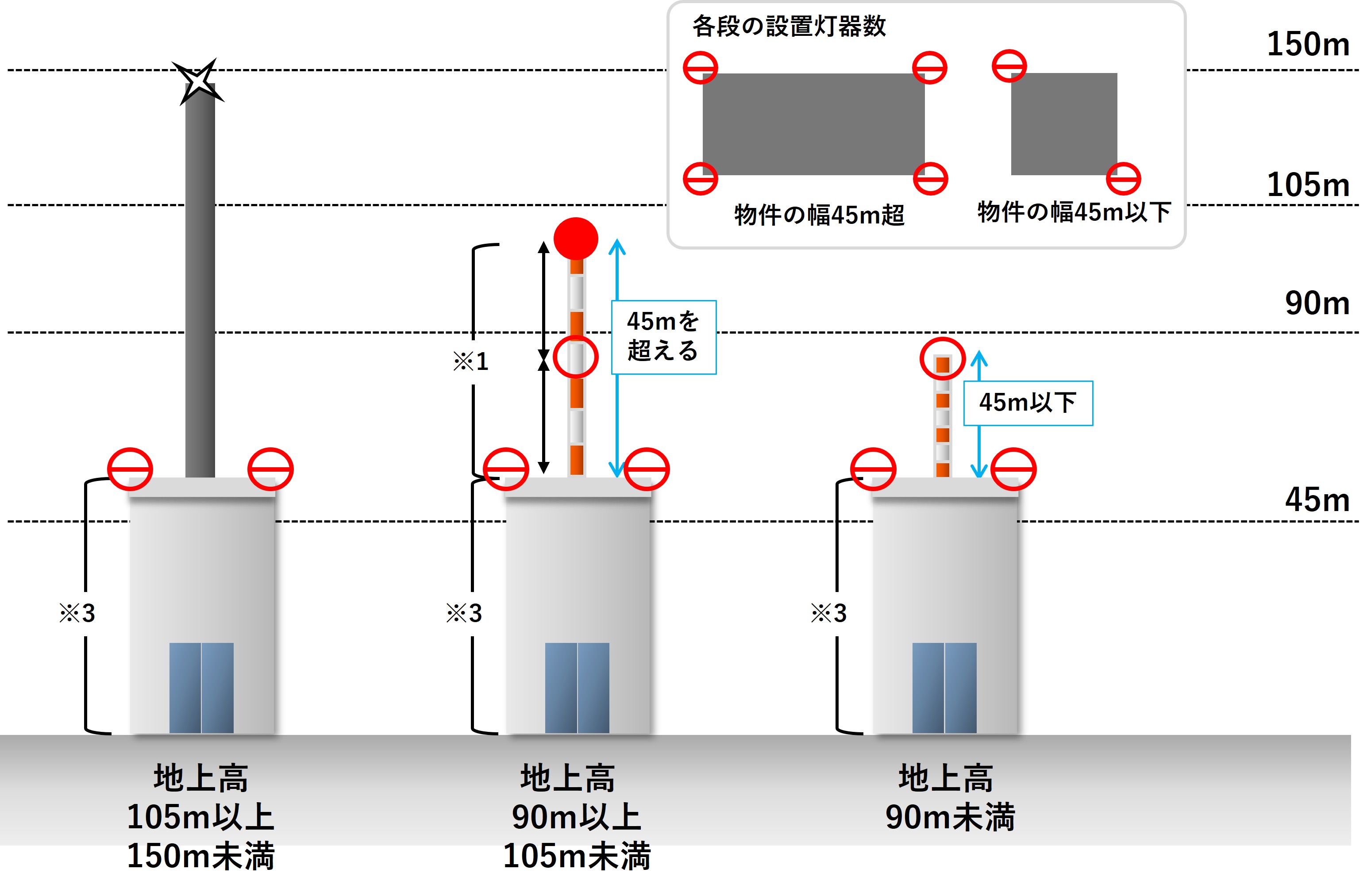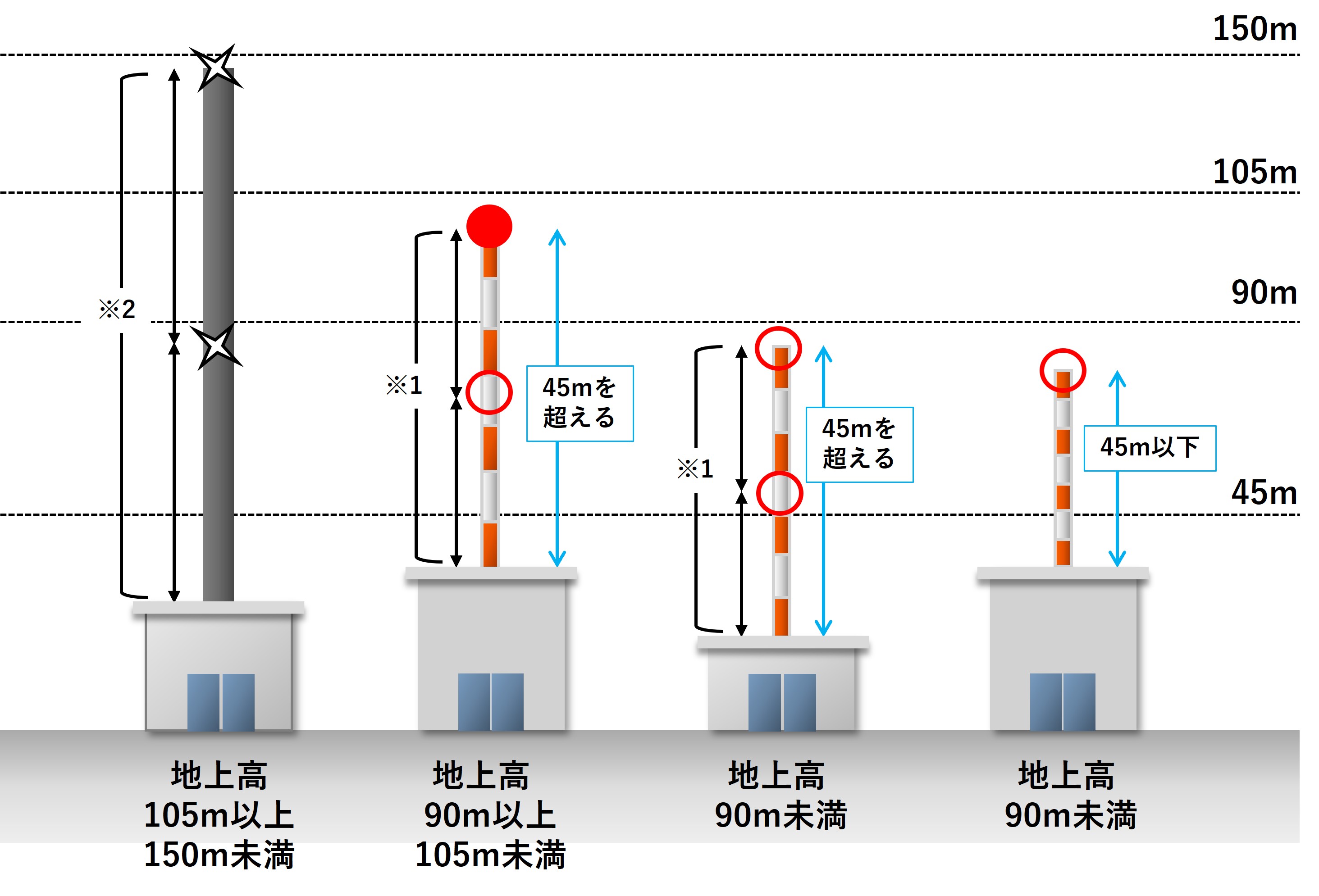 ※塔屋を含む150m以上の物件については「航空障害灯/昼間障害標識の設置等に関する解説・実施要領」をご参照ください。