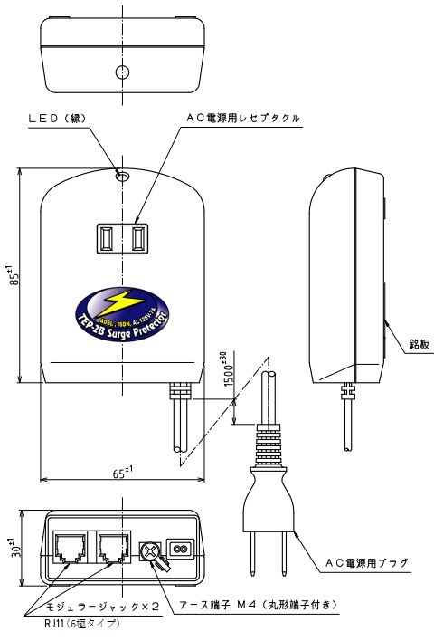 電源プラグ 1個、電源コンセント 1口、モジュラージャック 2口、アース端子(※) 1個 |