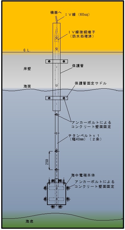 海中電極は、電極本体をチタン枠とサンアース(接地抵抗低減材)で形成し、海中からの立ち上げ線部にも、チタンを使用しています。さらに、設備へ配線するIV線の端末部には防水構造を採用しているため厳しい環境でも長寿命を維持します。海中電極の接地抵抗は、当社の試験結果より海中で2Ω以下の接地抵抗が得られます。