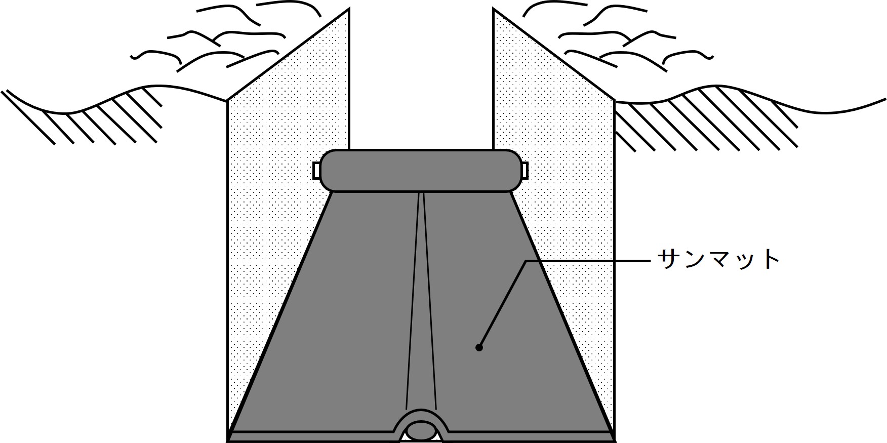 サンマットが破損しないように注意して土を約10cmの厚さまで埋め戻したら、その上を足で踏み固めます(下図のA部分)。