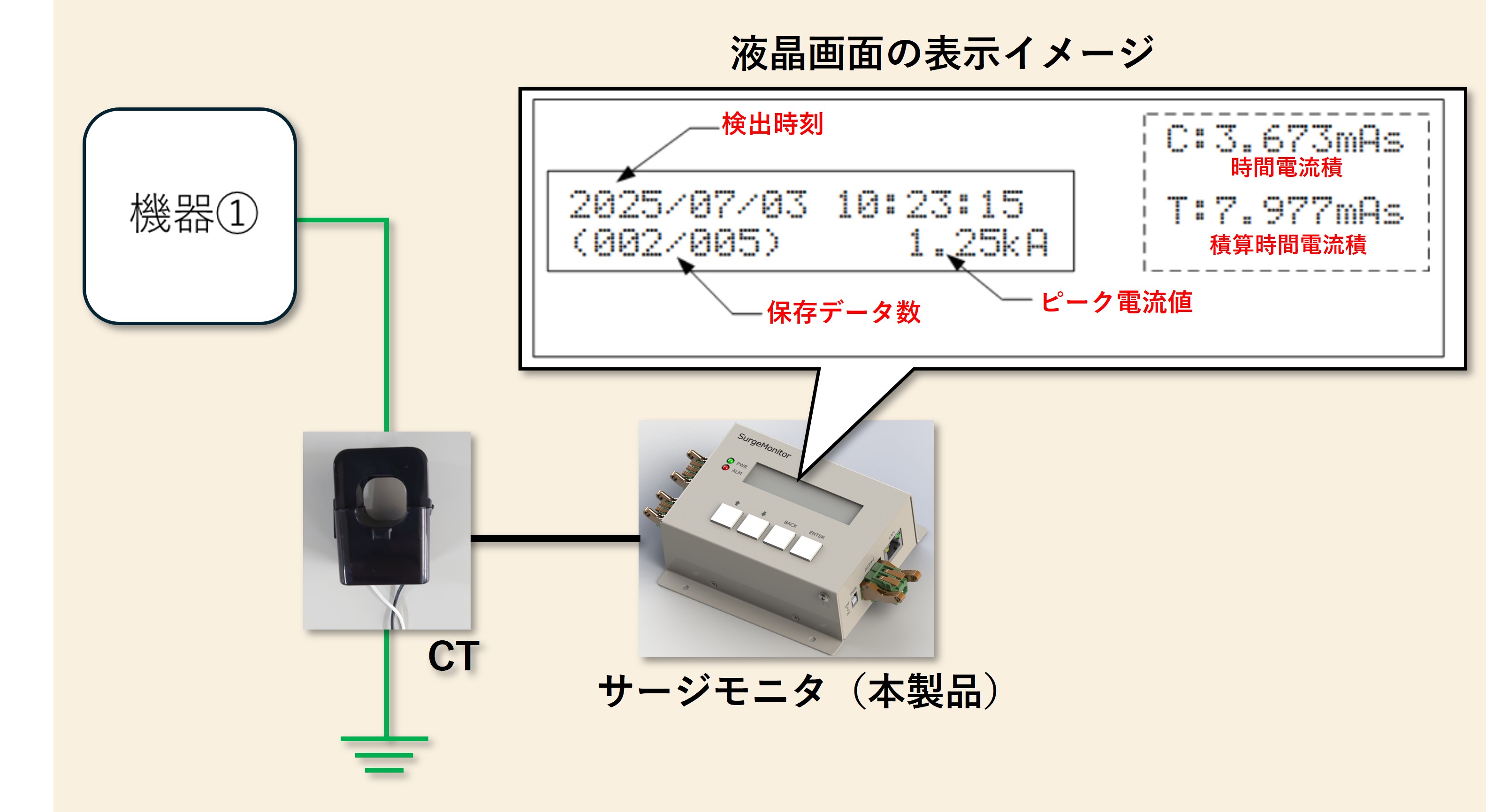 CT部を機器の接地線等に接続することで、接地線に流れる雷サージを検出・記録し、サージモニタ本体の液晶画面に表示します。
