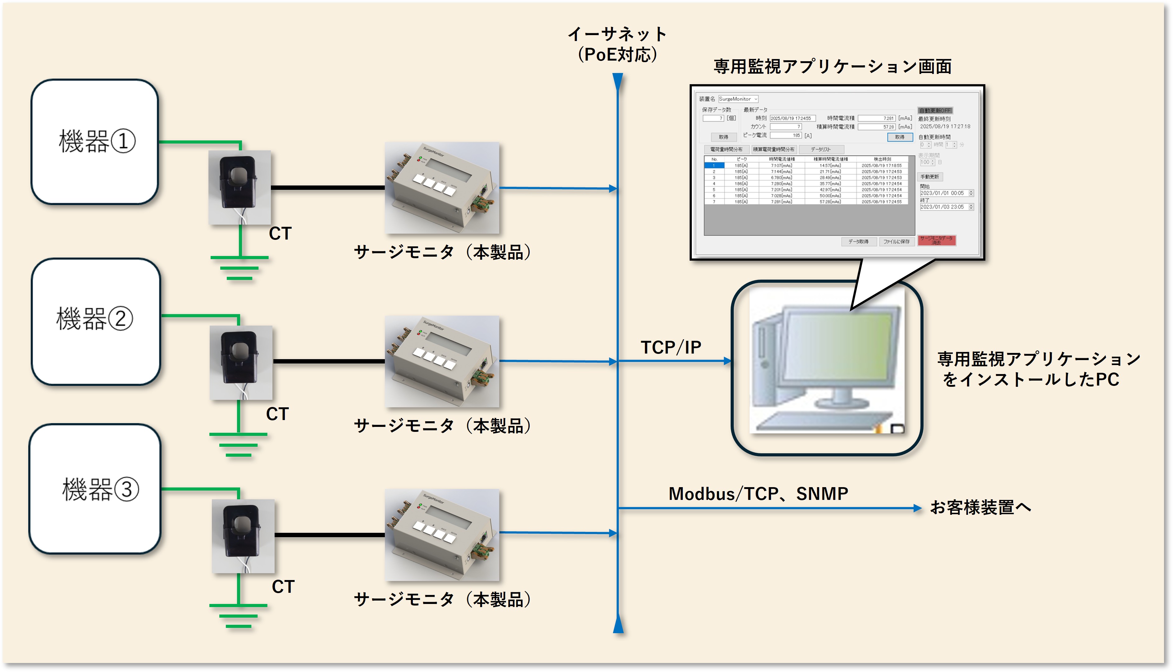 専用の監視アプリケーション(別売り)をインストールしたPCに接続することで、複数のサージモニタを遠隔で一括監視および操作可能です。